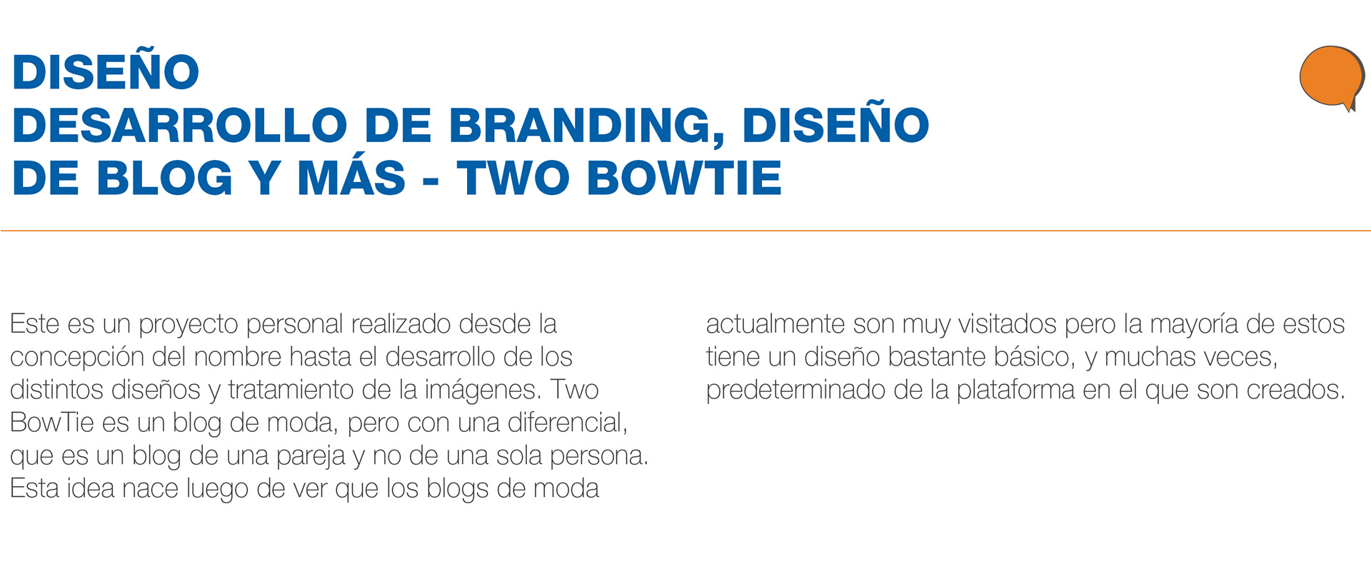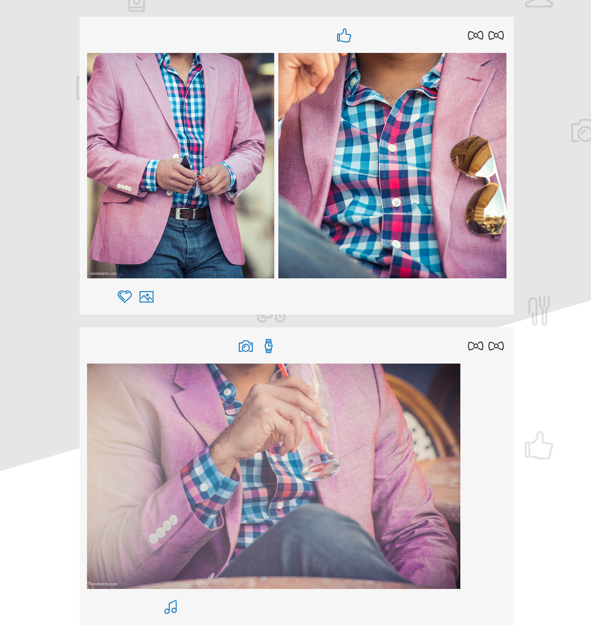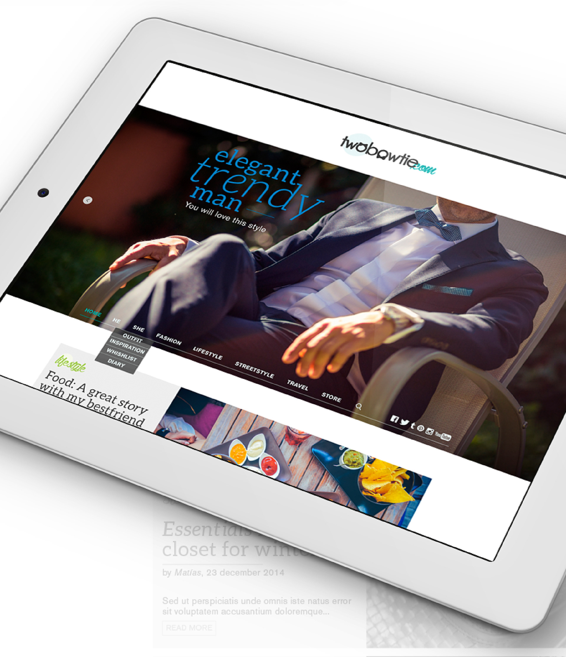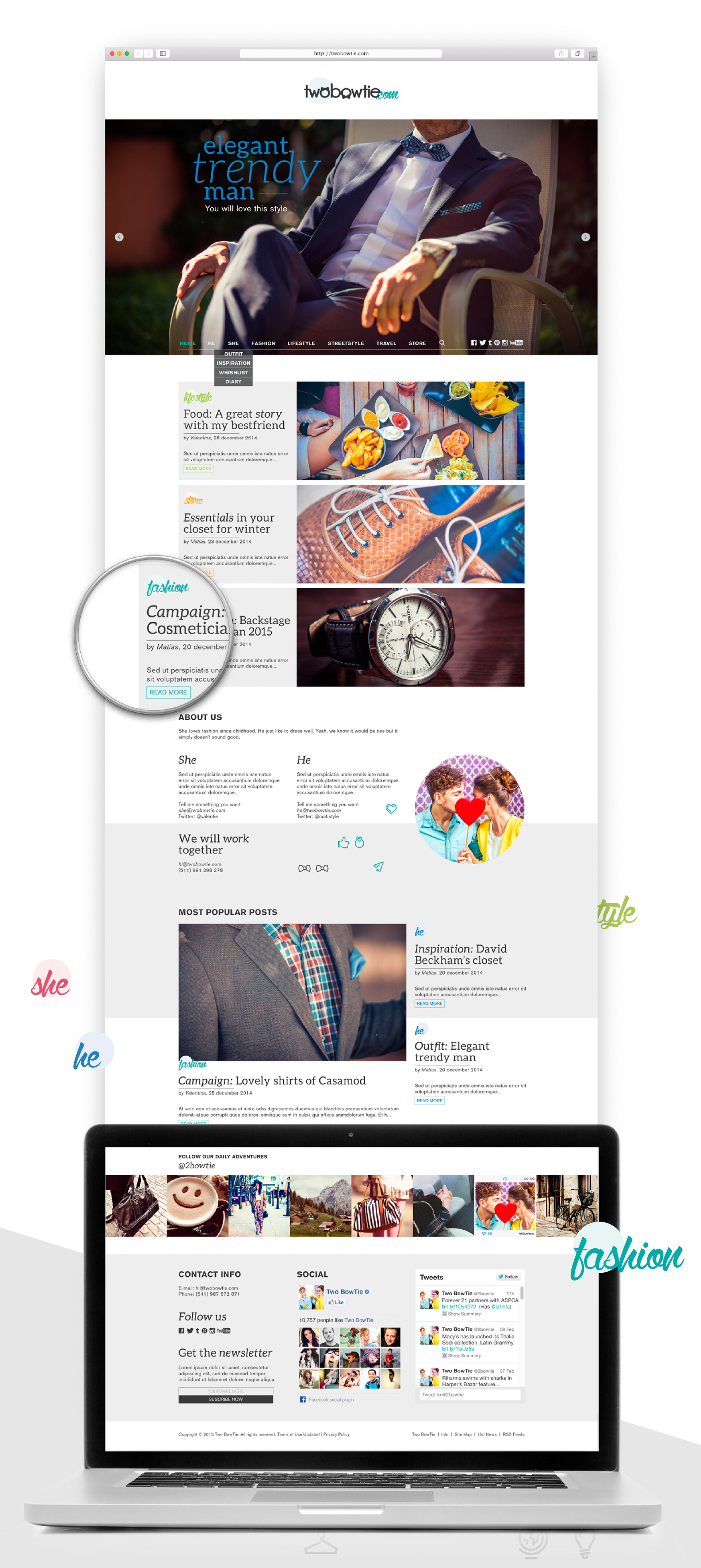 Año 2015. Este es un proyecto personal realizado desde la concepción del nombre hasta el desarrollo de los distintos diseños y tratamiento de la imágenes. Two BowTie es un blog de moda, pero con una diferencial, que es un blog de una pareja y no de una sola persona. Esta idea nace luego de ver que los blogs de moda actualmente son muy visitados pero la mayoría de estos tiene un diseño bastante básico, y muchas veces, predeterminado de la plataforma en el que son creados. Crédit icons: Vlad Cristea http://dribbble.com/GraphicDelivery Crédit photo: Dollar Photo Club https://www.dollarphotoclub.com
