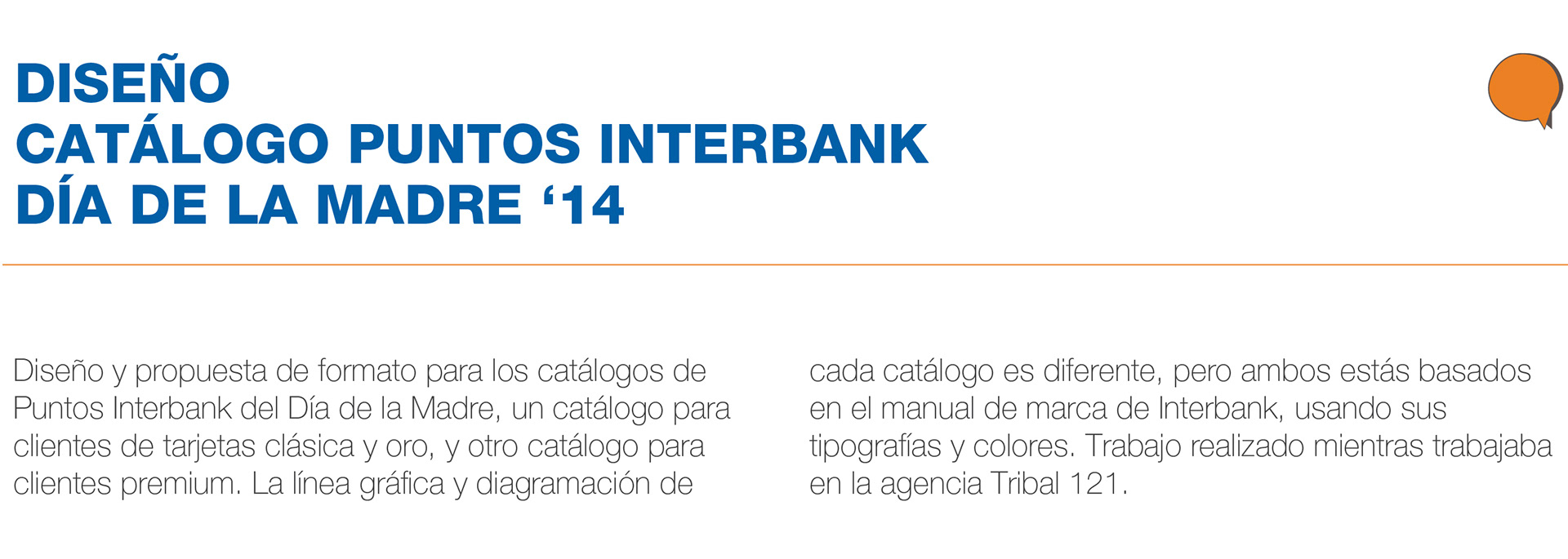 Año 2014. Diseño y propuesta de formato para los catálogos de Puntos Interbank del Día de la Madre, un catálogo para clientes de tarjetas clásica y oro, y otro catálogo para clientes premium. La línea gráfica y diagramación de cada catálogo es diferente, pero ambos estás basados en el manual de marca de Interbank, usando sus tipografías y colores. Trabajo realizado mientras trabajaba en la agencia Tribal 121.