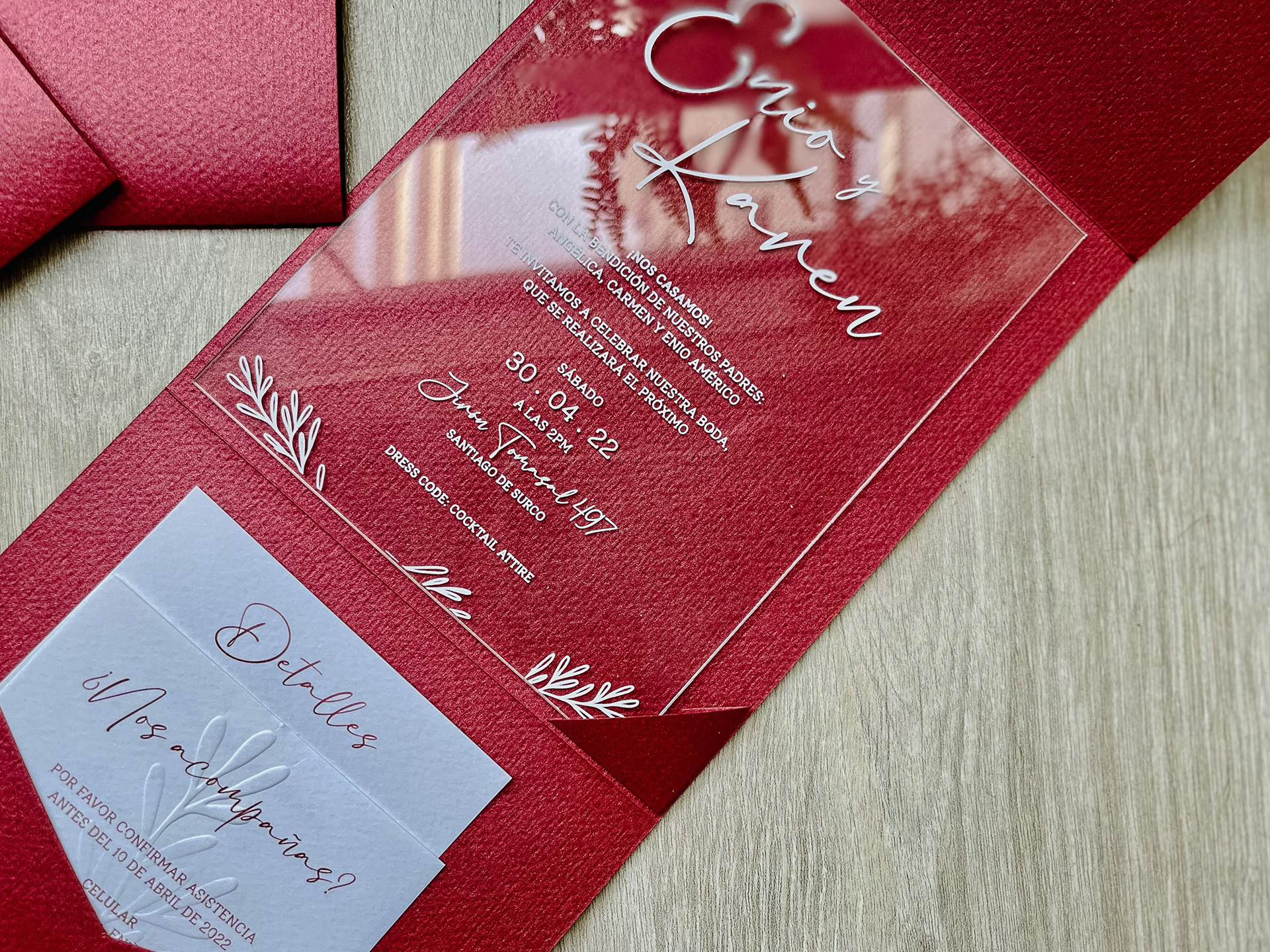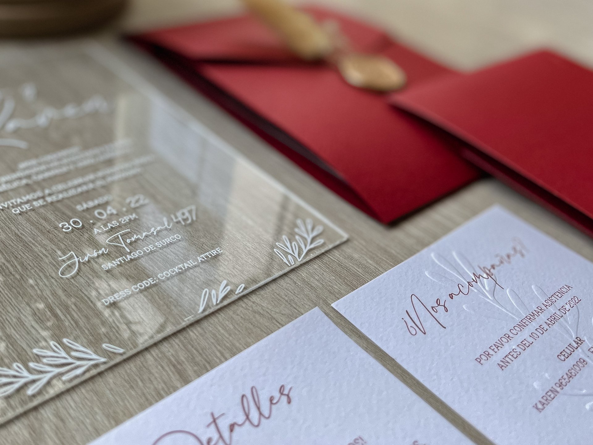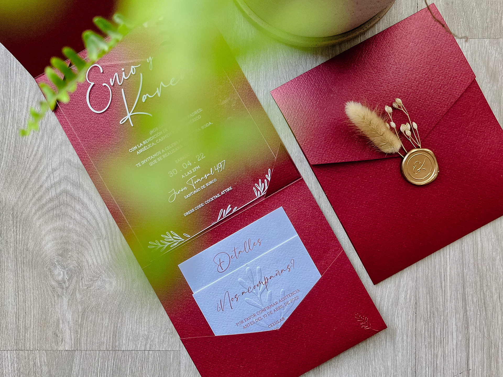 Invitaciones impresas en acrílico, tarjetas adicionales en papel blanco con detalles en relieve. Sobres color burgundy con detalles en relieve, cerrado con una ramita y sello lacrado, nombres serigrafiados.