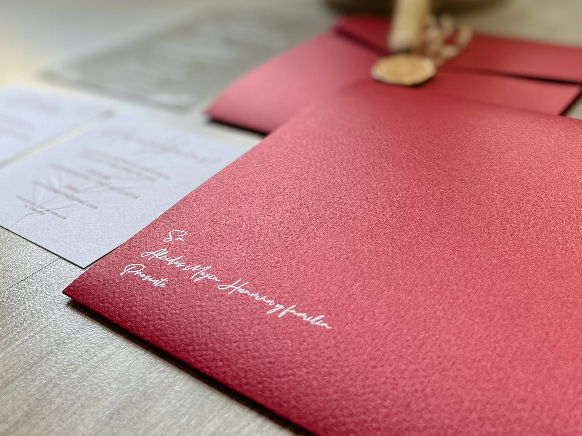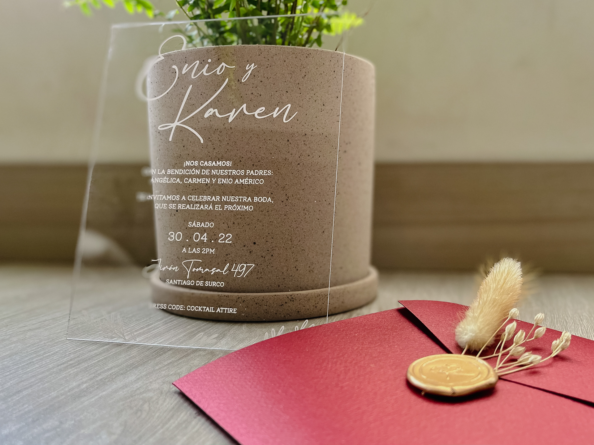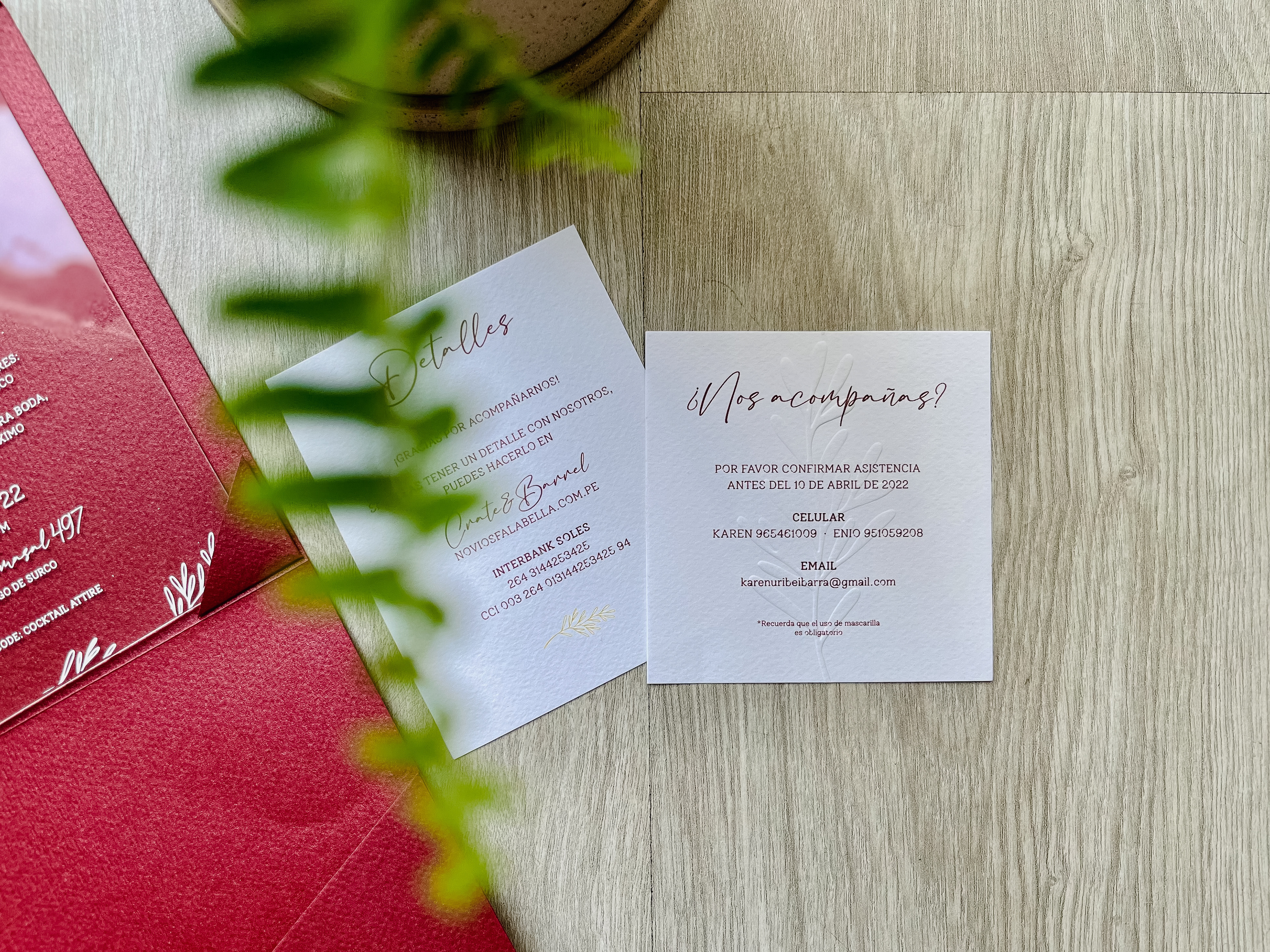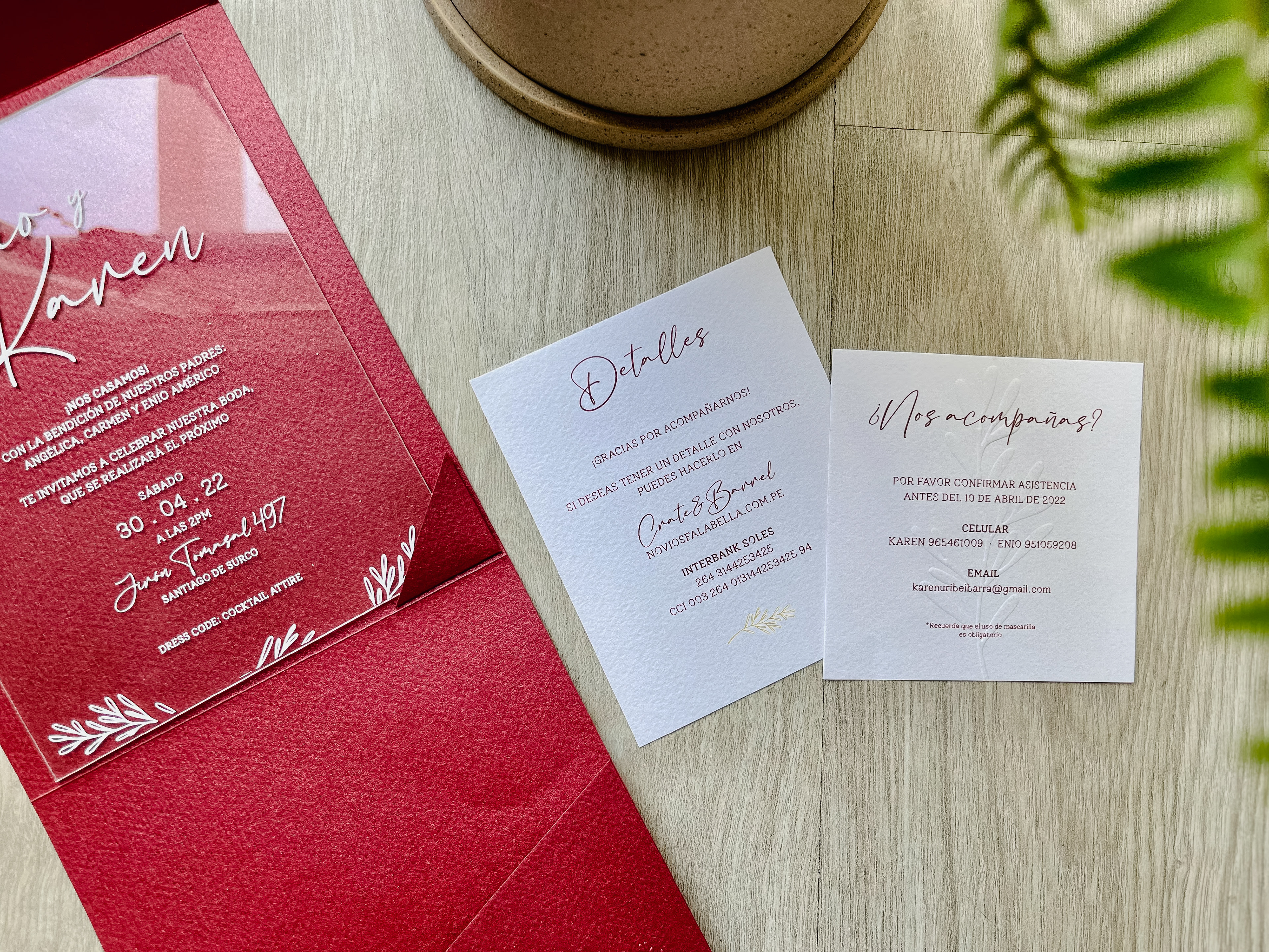 Invitaciones impresas en acrílico, tarjetas adicionales en papel blanco con detalles en relieve. Sobres color burgundy con detalles en relieve, cerrado con una ramita y sello lacrado, nombres serigrafiados.