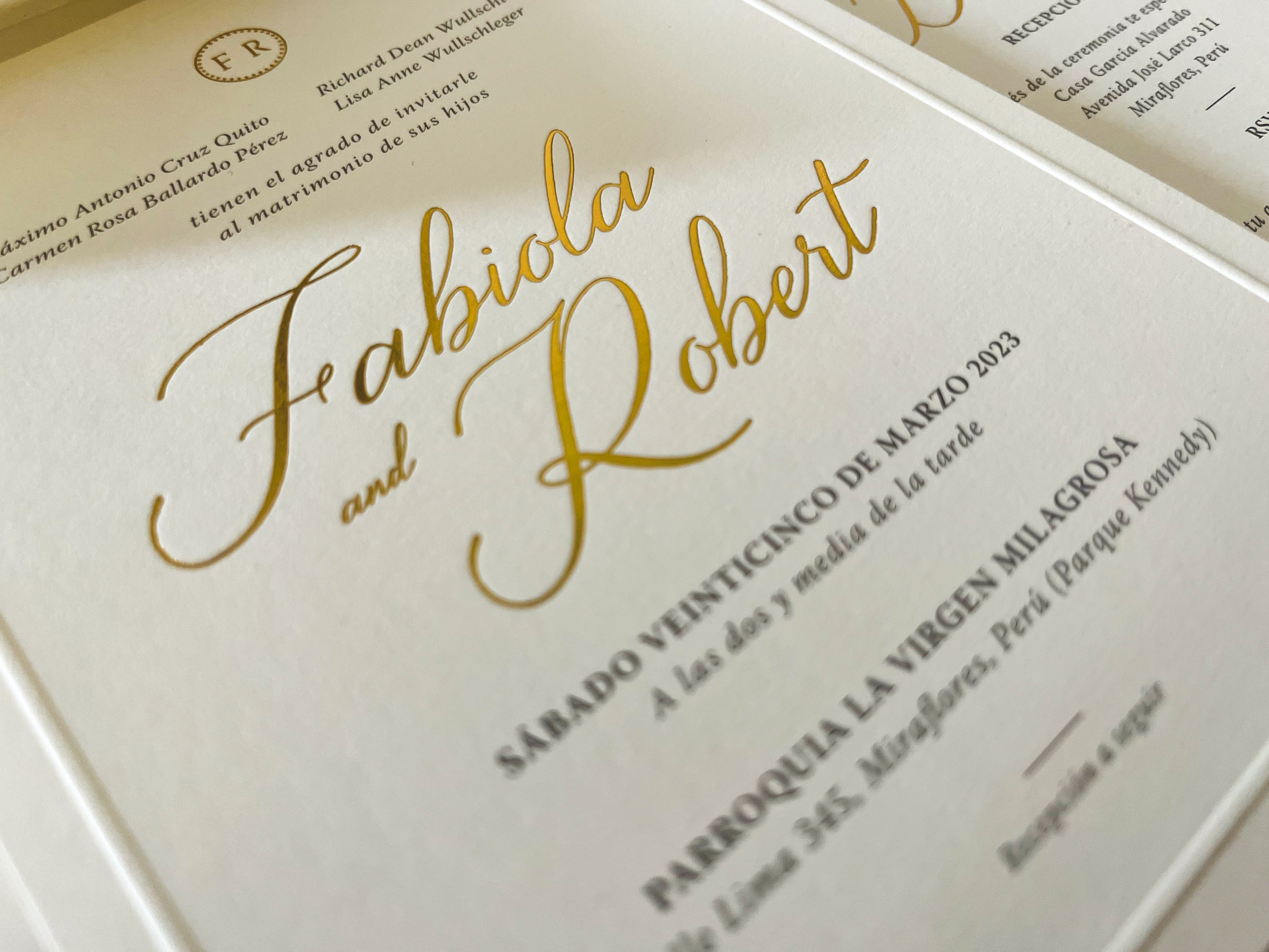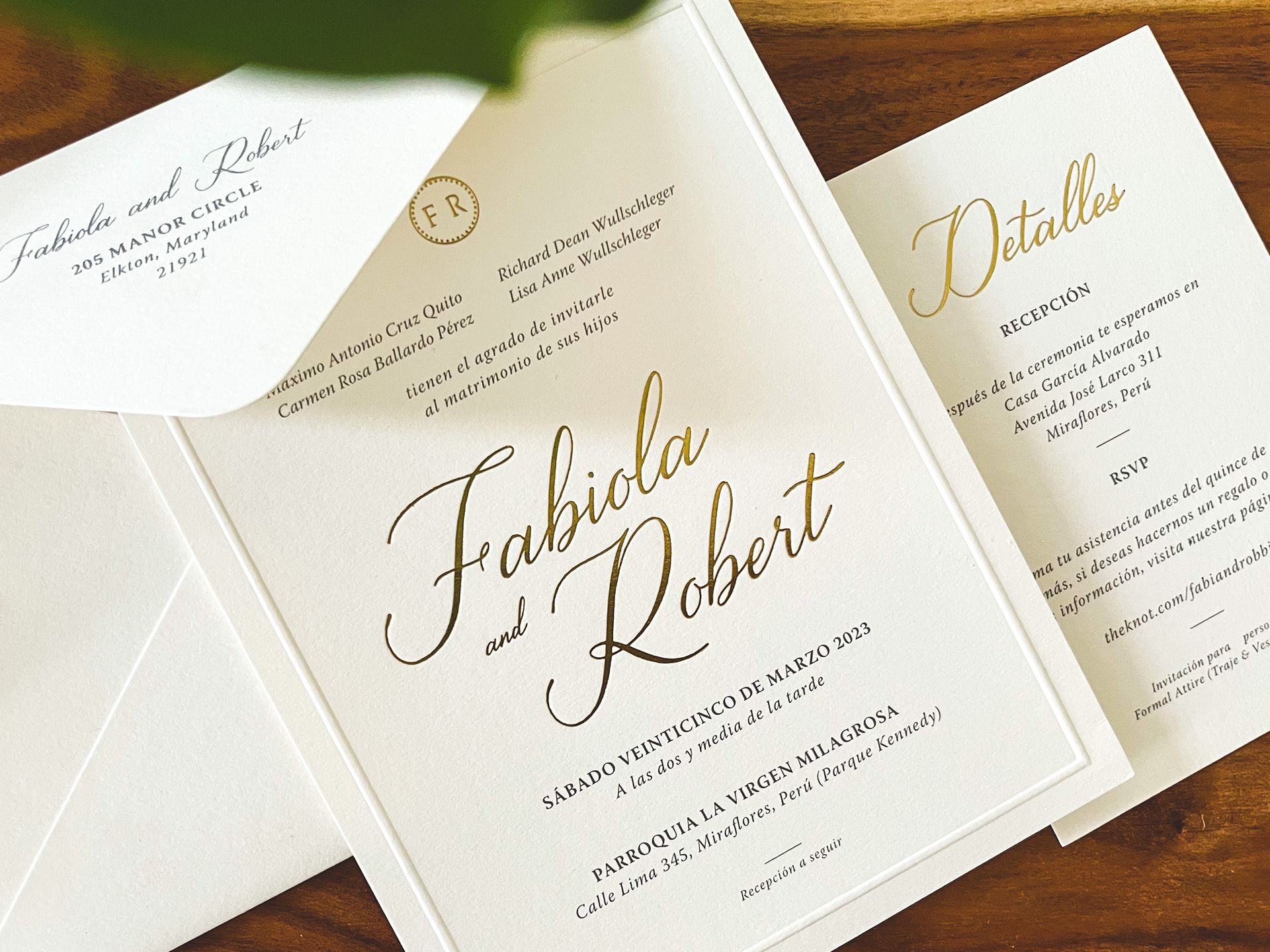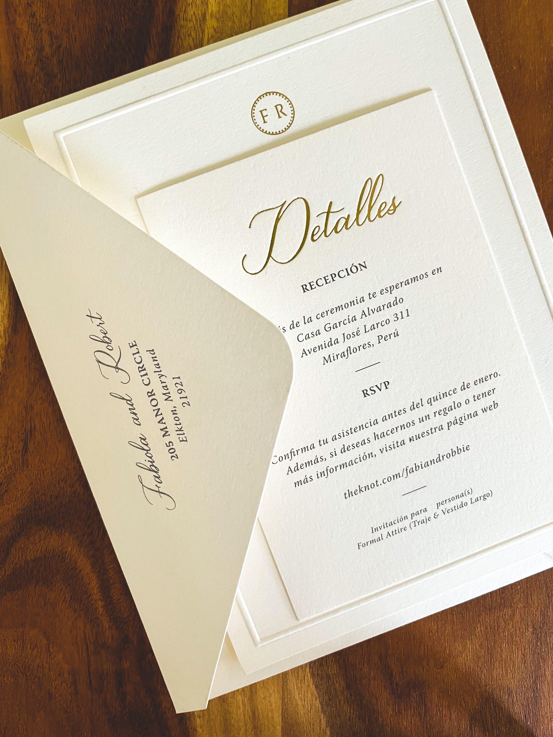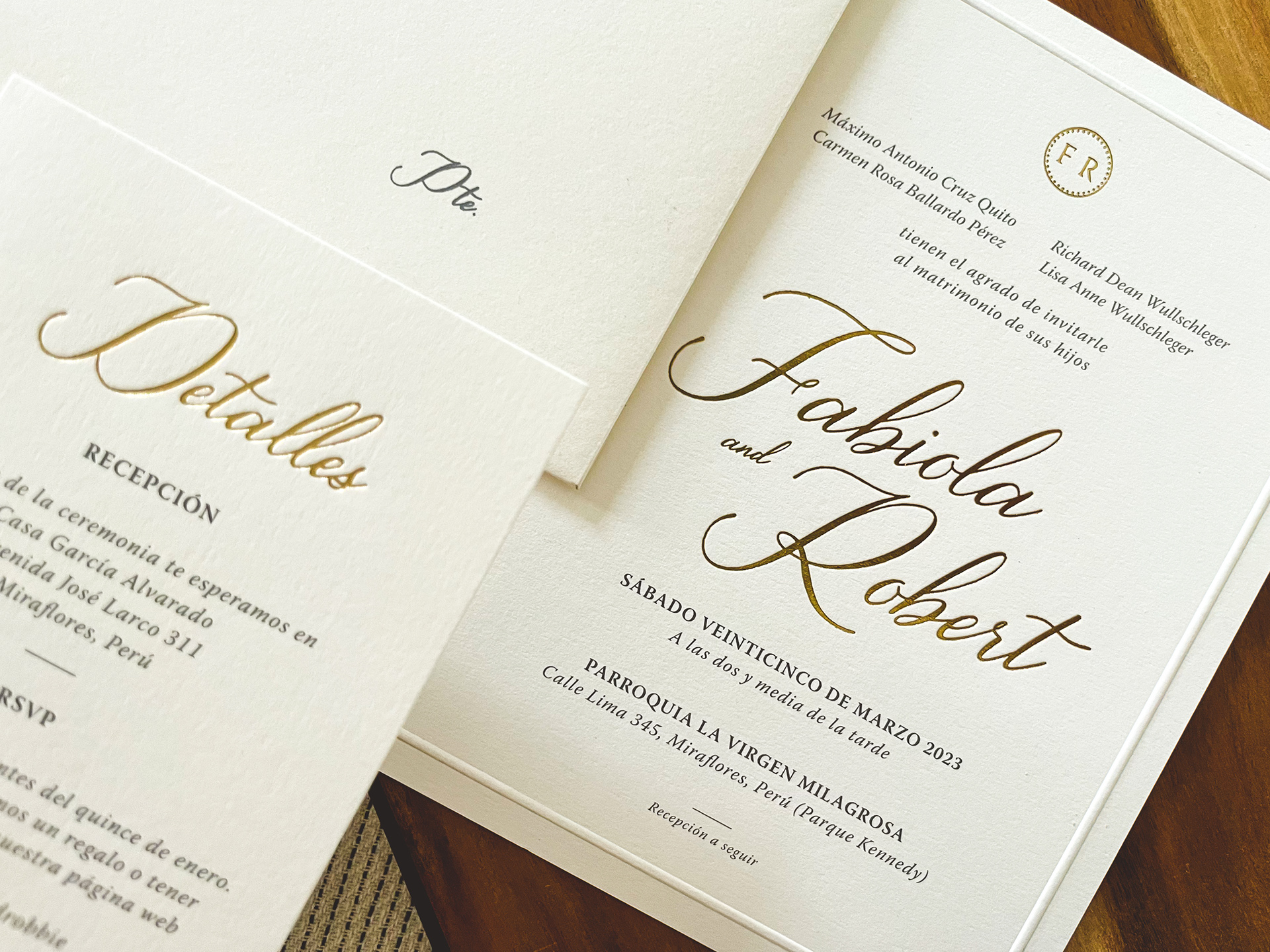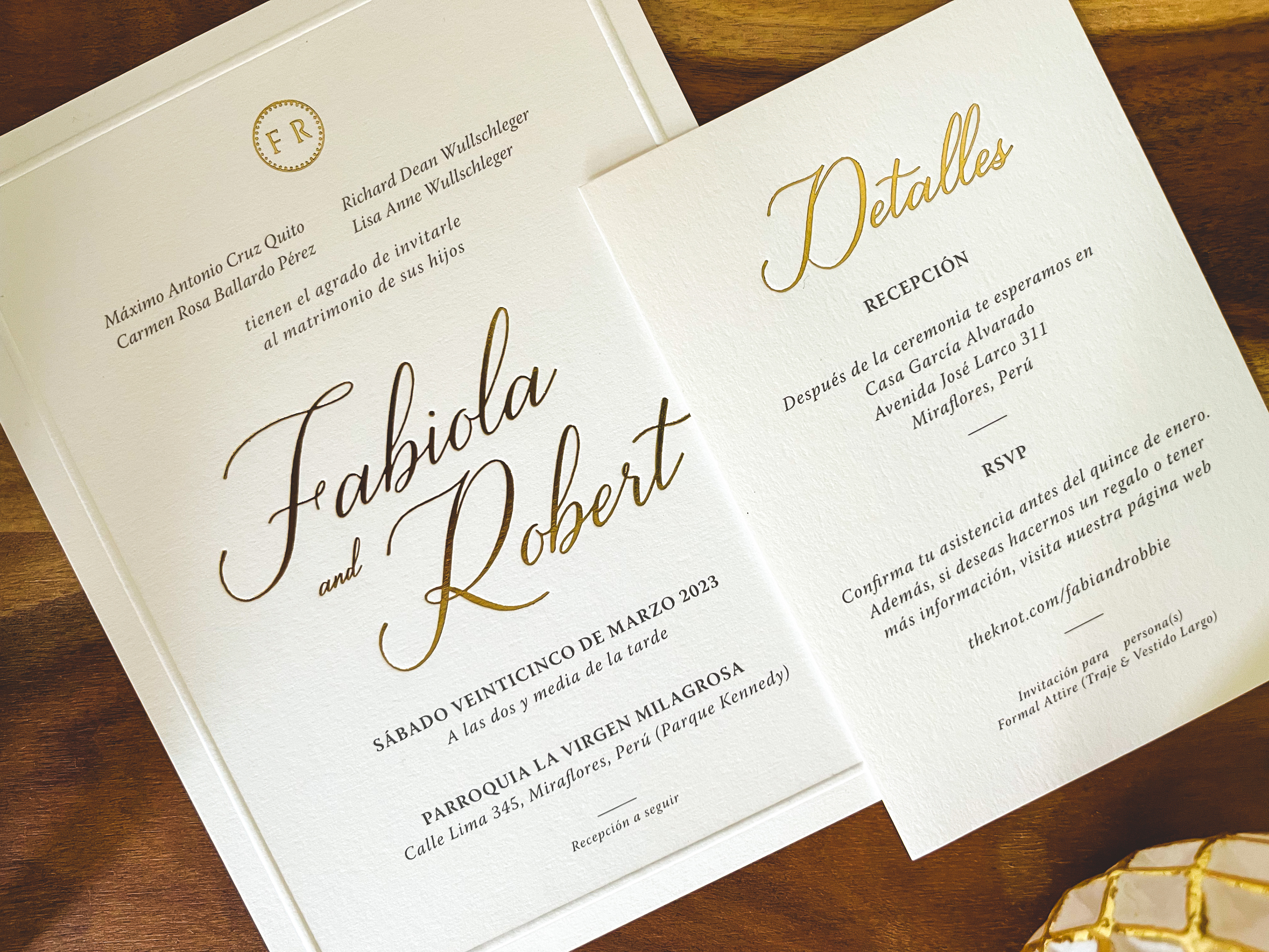 Invitaciones impresas en papel blanco con detalles en foild oro viejo y marco de alto relieve. Nombres y datos impresos en cada sobre. Tarjeta principal, tarjeta de detalles y sobre.